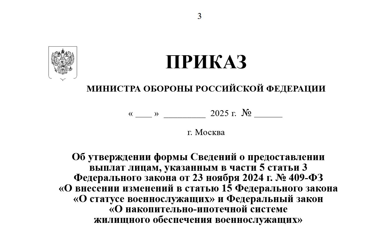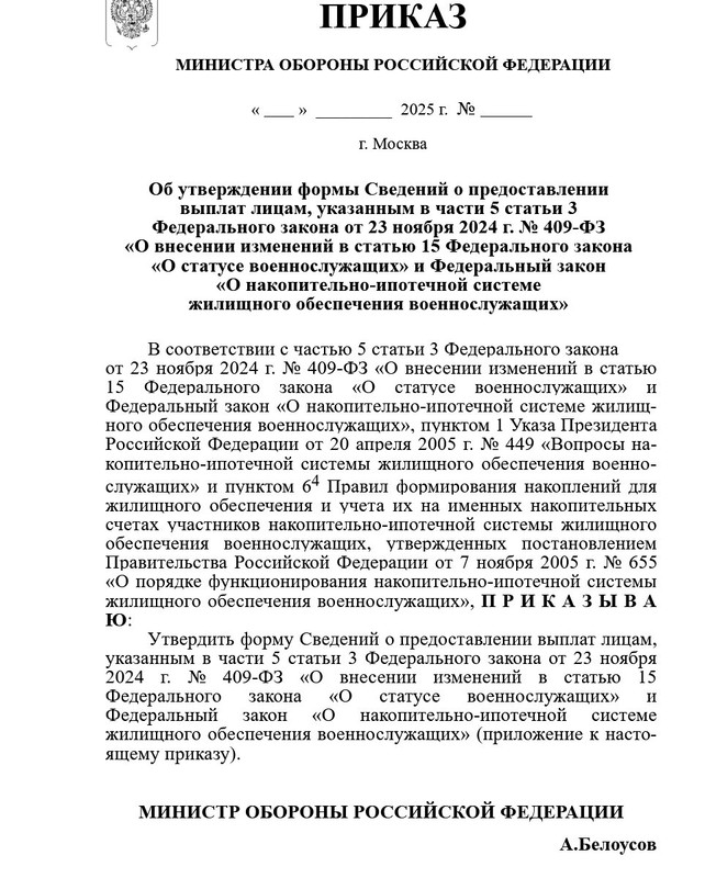 Утвердить форму Сведений о предоставлении выплат лицам, указанным в части 5 статьи 3 Федерального закона от 23 ноября 2024 г. № 409-ФЗ «О внесении изменений в статью 15 Федерального закона «О статусе военнослужащих» и Федеральный закон «О накопительно-ипотечной системе жилищного обеспечения военнослужащих» (приложение к настоящему приказу)."